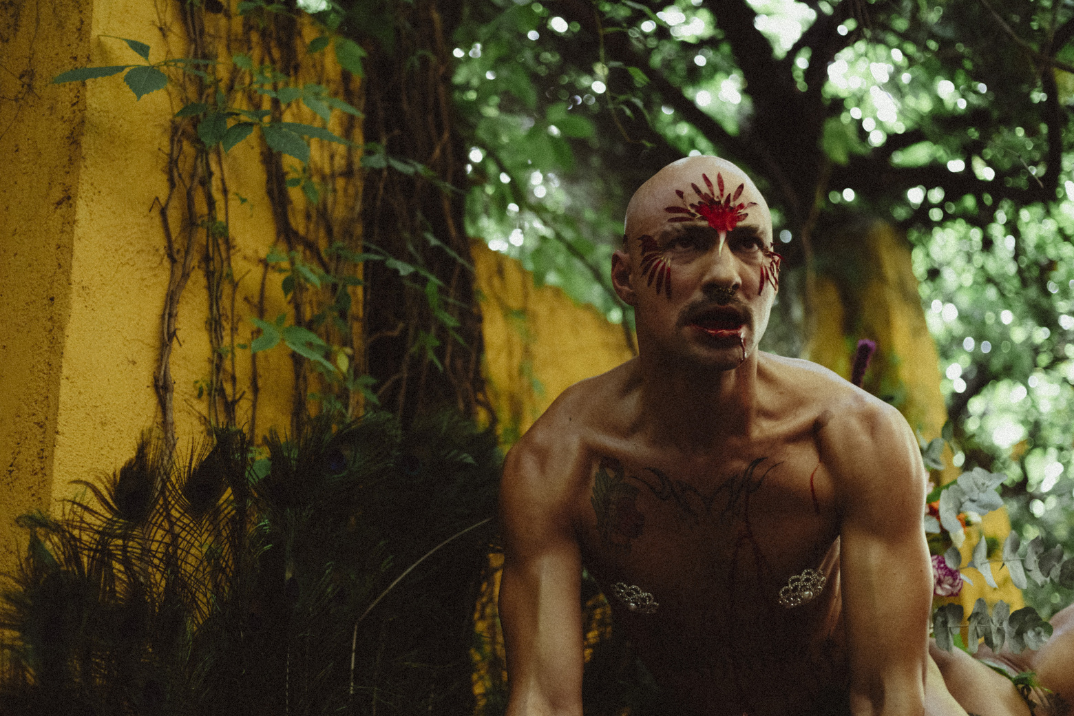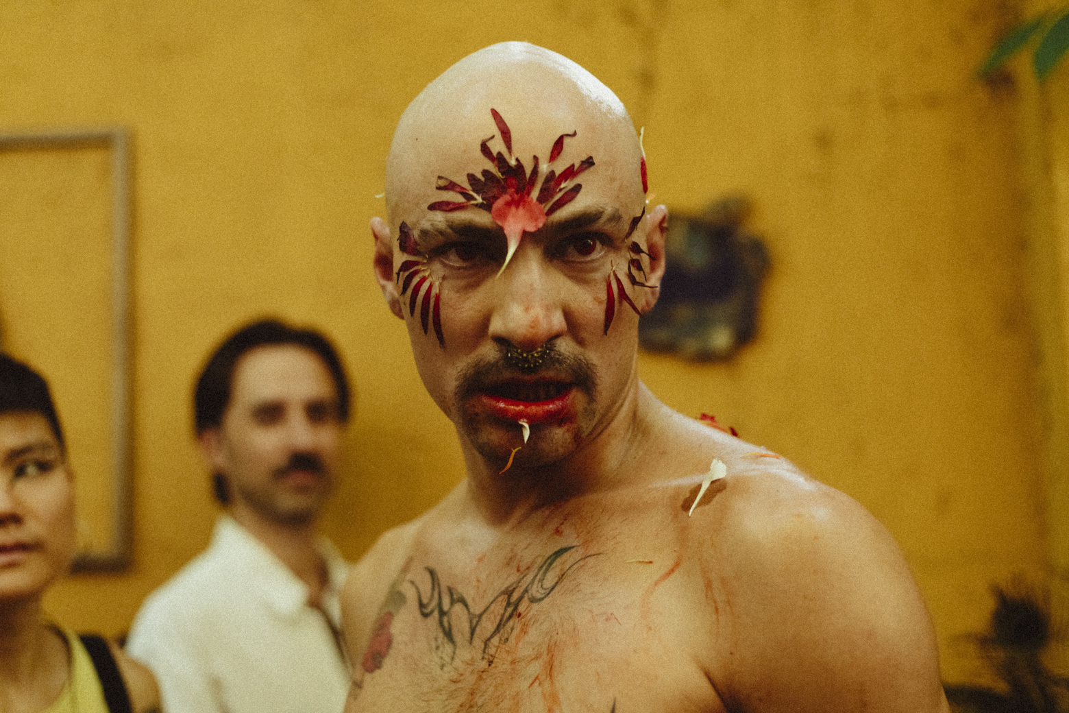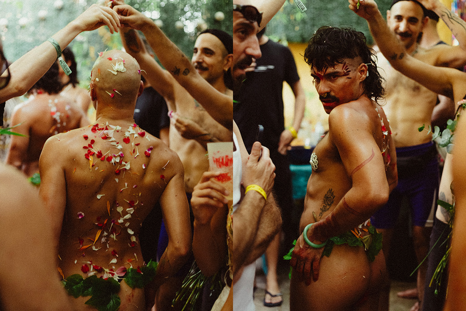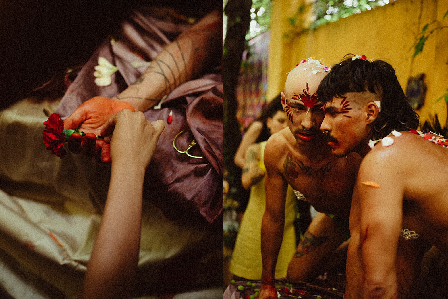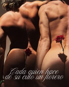 Cada quien hace de su culo un florero is inspired by a detail from the triptych The Garden of Earthly Delights by Hieronymus Bosch, in which a flower sprouts from the anus of a human figure. Rather than paying homage to Bosch, the work reclaims and intervenes his imagery through a Latinx, non-binary, and radically performative lens, where the body, once a passive object of the heteronormative colonial gaze, becomes a body-altar, exerting its own desire.