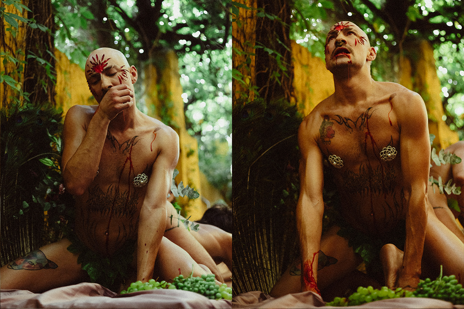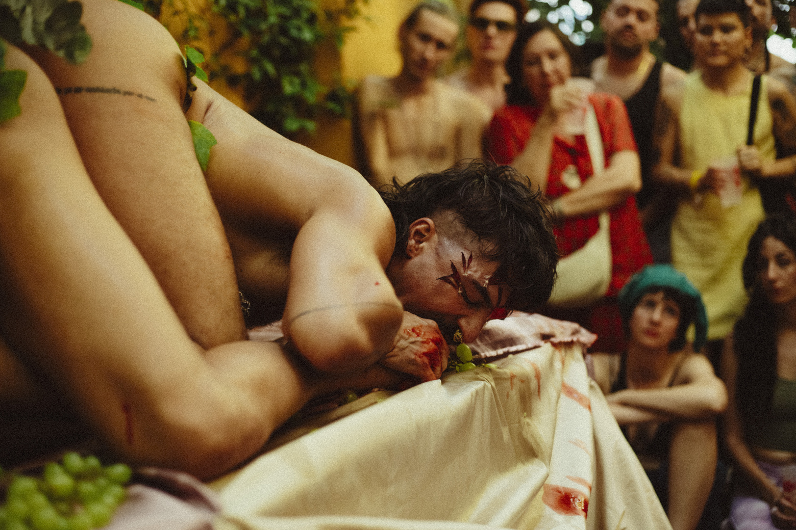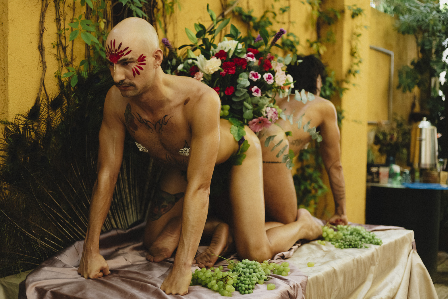 The performance unfolds as a living installation and happening where the visual, the bodily, and the symbolic intertwine in an undefined space. Two naked non-binary bodies hold each other in a baroque gesture. By joining their asses, they become a living vase where beauty blends with the grotesque, the obscene with the sublime, the intimate with the public. The work borrows aesthetics from baroque art, still life, and romanticism to compose a “living painting” in which the anus, long cast as a zone of shame by colonial Christian morality, is reimagined as a site of birth, blooming, and offering.
